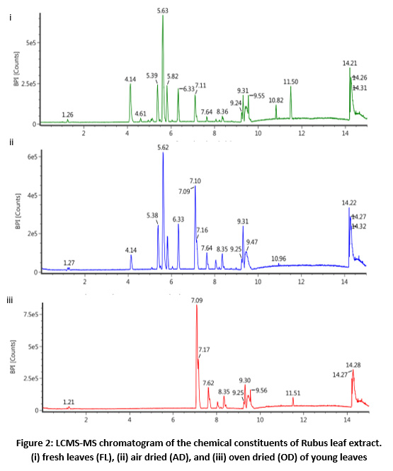 Figure 2: LCMS-MS chromatogram of the chemical constituents of Rubus leaf extract. (i) fresh leaves (FL), (ii) air dried (AD), and (iii) oven dried (OD) of young leaves Click here to View Figure |