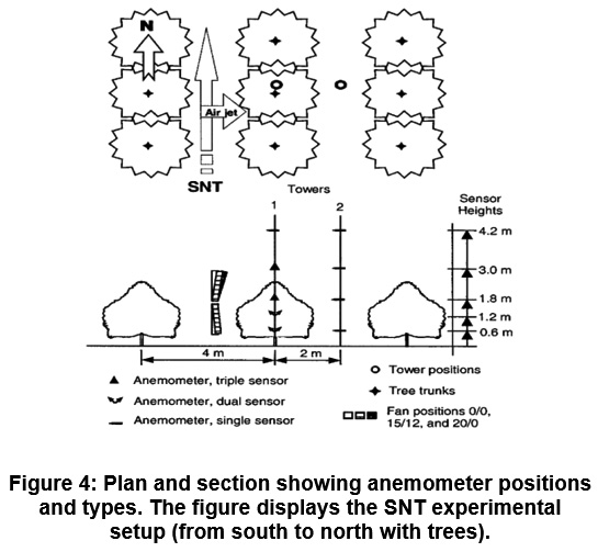 Figure 4: Plan and section showing anemometer positions and types. The figure displays the SNT experimental setup (from south to north with trees). Click here to View Figure |