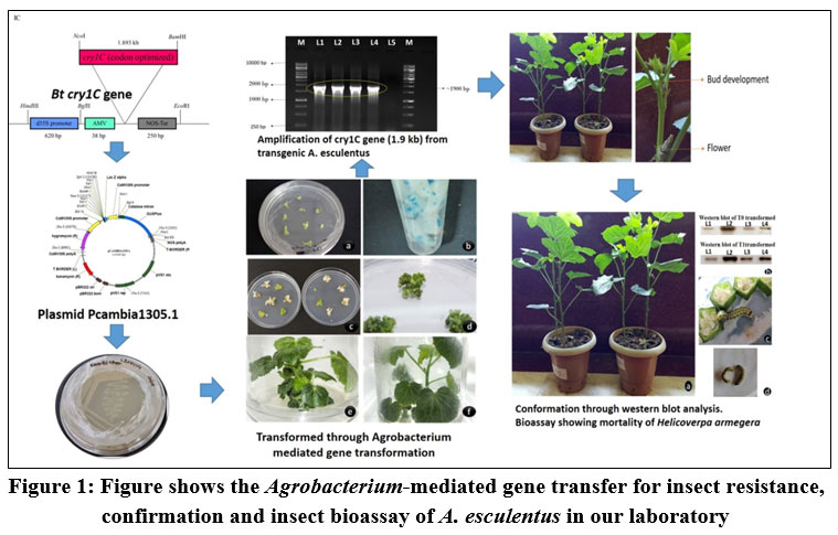 Figure 1: Figure shows the Agrobacterium-mediated gene transfer for insect resistance, confirmation and insect bioassay of A. esculentus in our laboratory |