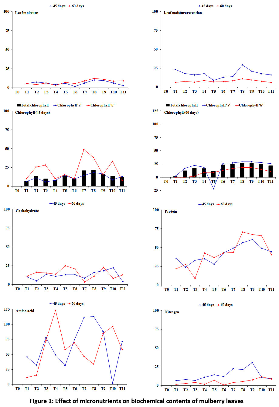 Moisture content in mulberry leaves is a very important factor which influences silkworm growth, as it has an intimate relation to an easy ignition of leaves to silkworm, as high moisture make it more palatable to them. Micronutrients treated mulberry leaves revealed significant variations in moisture and moisture retention capacity. Yokoyama30 reported 64-83% moisture content in mulberry leaves. On the 45th and 60th day of pruning, the moisture capacity in the present study increased to 10.30% – 12.39% as the maximum in T8 treatment (CuSO4 10Kg/ha + ZnSO4 10Kg/ha + FeSO4 20Kg/ha) when compared to control. Higher moisture content in T8 treatment may be due to genetic character, and influence of balanced fertilizers combination which helped in uptake of available nutrients. During the study period, the tender leaves had more moisture content than middle and bottom leaves. Leaves possessing higher leaf moisture content are recognised as good quality leaves,31,32 and are considerably related to the silkworm growth and nutritional parameters33 The moisture content in mulberry leaves plays an important part in uplifting the nutritional levels, which in turn improves the scrumptiousness and digestibility of leaves by silkworms, feeding efficiency of silkworm larvae, increased growth rate, as well as quality development of cocoon.34,35 An optimum level of leaf moisture content is directly related to the growth of silkworm, since low leaf moisture content influences the assimilation and conversion efficiency of food (energetic parameters) to decrease. Sinha et al.36 reported that corresponding increased leaf growth and maturity can lead to a gradual decreased in the moisture content of mulberry leaves. The present findings correlated with the above facts. The enhancement of leaf moisture due to application of micronutrients might be due to enhancement of organic matter and water holding capacity in the soil, thereby, increasing the water absorption by plant.37 The current observations are related to the results of Babu et al.38 too. Increased leaf moisture content, and fresh leaf weight are due to the water retention capacity which steadily supplies moisture to the leaf. Further, microbial inoculants in the soil rhizosphere may also facilitate in the moisture accessibility, towards water uptake and added metabolic activities for upholding normal plant growth.