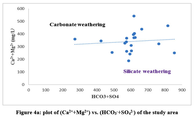 Figure 4a: plot of (Ca2++Mg2+) vs. (HCO3–+SO42-) of the study area. |
