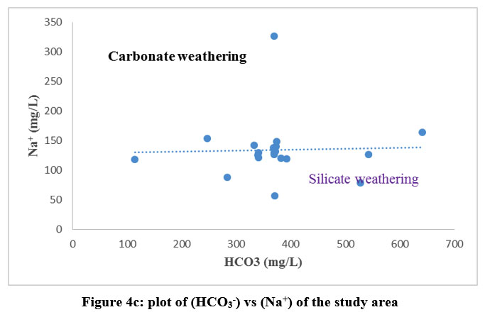 Figure 4c: plot of (HCO3–) vs (Na+) of the study area |