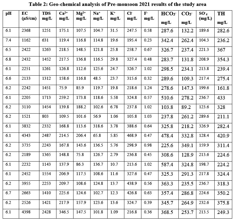 Table 2: Geo-chemical analysis of Pre-monsoon 2021 results of the study area. |