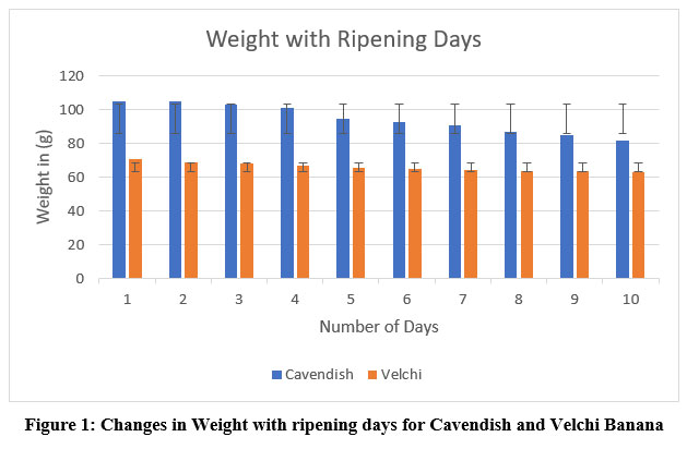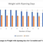 Figure 1: Changes in Weight with ripening days for Cavendish and Velchi Banana. |