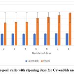 Figure 2: Pulp to peel ratio with ripening days for Cavendish and Velchi Banana |