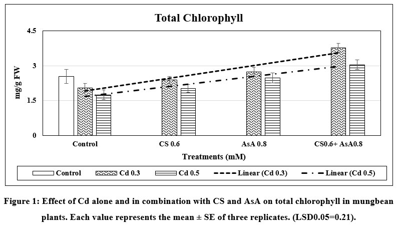 Figure 1: Effect of Cd alone and in combination with CS and AsA on total chlorophyll in mungbean plants. Each value represents the mean ± SE of three replicates. (LSD0.05=0.21). |