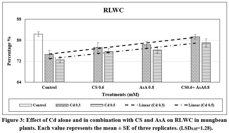 Figure 3: Effect of Cd alone and in combination with CS and AsA on RLWC in mungbean plants. Each value represents the mean ± SE of three replicates. (LSD0.05=1.28). |