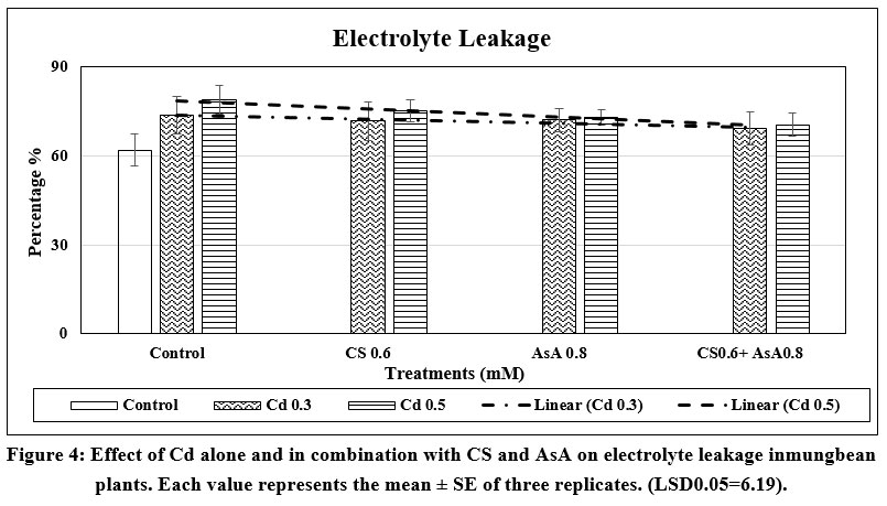 Figure 4: Effect of Cd alone and in combination with CS and AsA on electrolyte leakage in mungbean plants. Each value represents the mean ± SE of three replicates. (LSD0.05=6.19). |