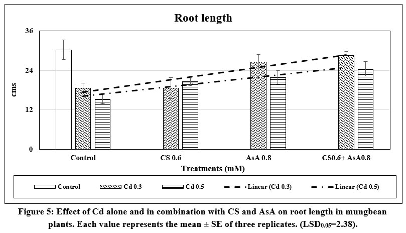 Figure 5: Effect of Cd alone and in combination with CS and AsA on root length in mungbean plants. Each value represents the mean ± SE of three replicates. (LSD0.05=2.38). |