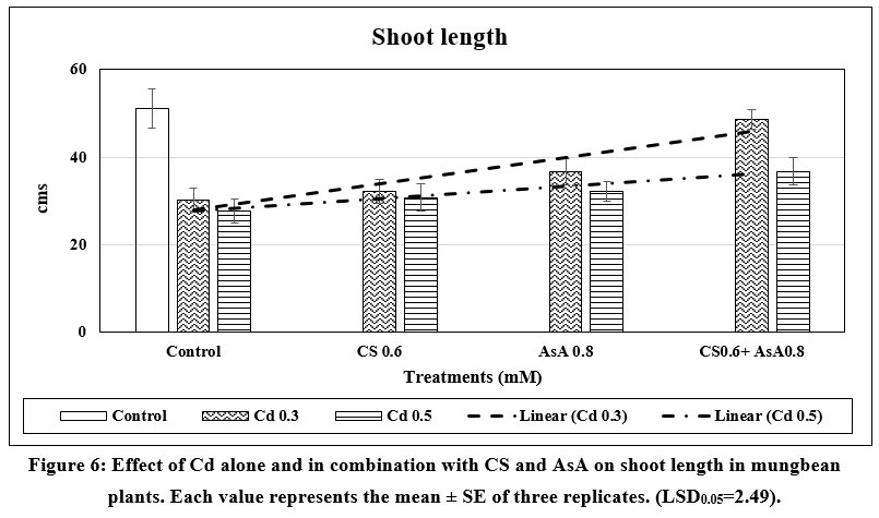 Figure 6: Effect of Cd alone and in combination with CS and AsA on shoot length in mungbean plants. Each value represents the mean ± SE of three replicates. (LSD0.05=2.49). |