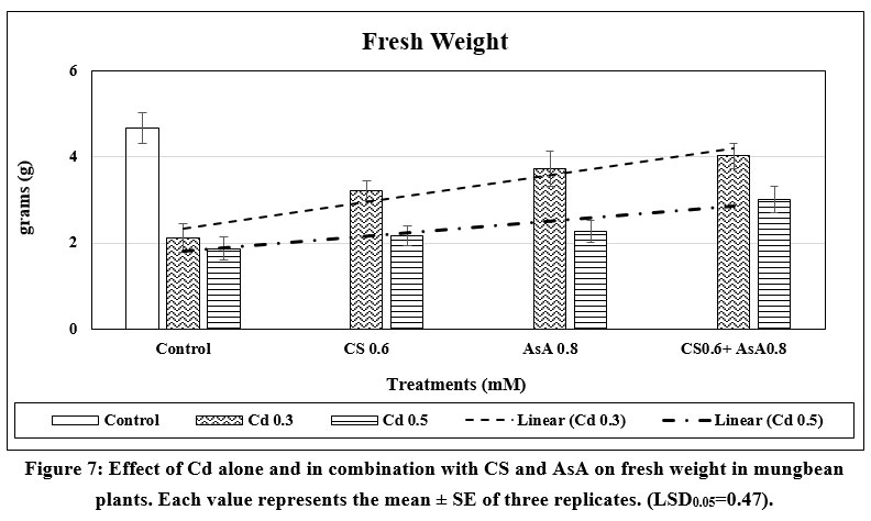 Figure 7: Effect of Cd alone and in combination with CS and AsA on fresh weight in mungbean plants. Each value represents the mean ± SE of three replicates. (LSD0.05=0.47). |