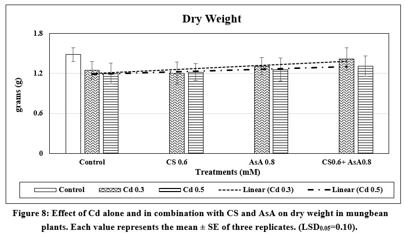 Figure 8: Effect of Cd alone and in combination with CS and AsA on dry weight in mungbean plants. Each value represents the mean ± SE of three replicates. (LSD0.05=0.10). |