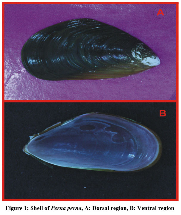 Figure 1: Shell of Perna perna, A: Dorsal region, B: Ventral region |