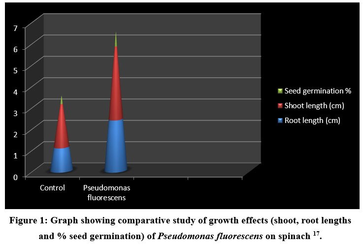 Figure 1: Graph showing comparative study of growth effects (shoot, root lengths and % seed germination) of Pseudomonas fluorescens on spinach 17. |