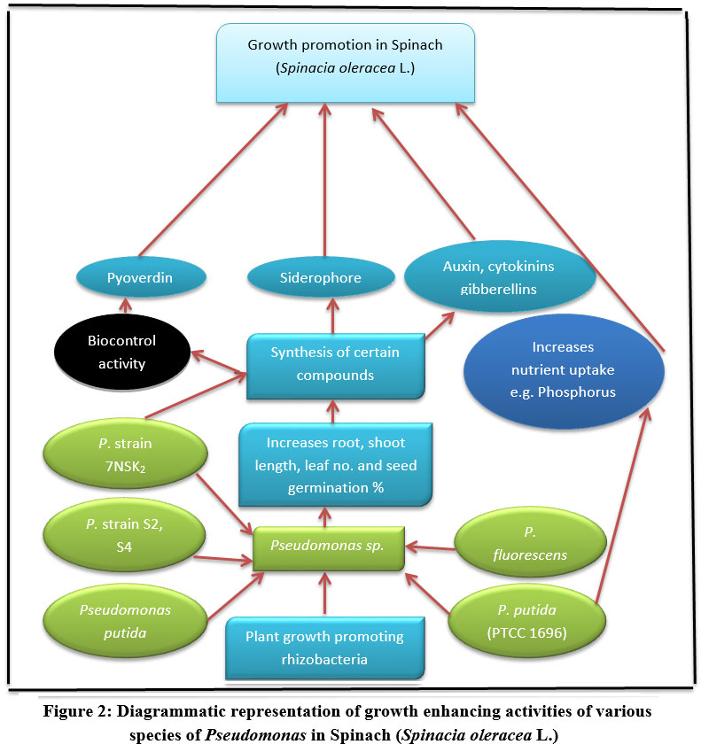 Figure 2: Diagrammatic representation of growth enhancing activities of various species of Pseudomonas in Spinach (Spinacia oleracea L.). |