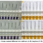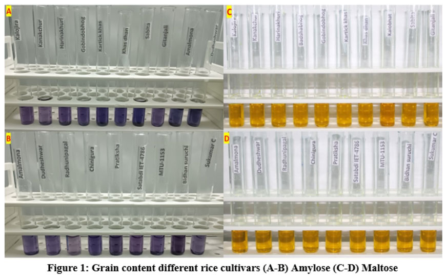 Figure 1: Grain content different rice cultivars (A-B) Amylose (C-D) Maltose |