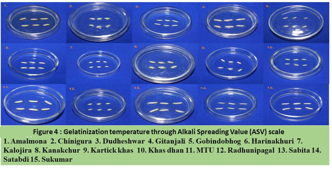 Alkali spreading value (ASV) is another important determinant in ECQ supported by ¹⁸. ASV is the measure of tendency to alkali digestion. This ASV is inversely related to gelatinization temperature (GT). ASV is directly related to the presence of short chain amylopectin in grain starch that means short chain amylopectin easily digests the grain under an alkali solution, Figure 4 which make its gelatinization temperature high (i.e., cooking time high) as shown by cultivar Dudheshwar (DUD) ²⁰. In cultivar Gitanjali (GIT), a lower gelatinization temperature (GT) value can be seen Figure 4, due to low amylose content, which helps to gelatinize the starch comparatively at lower temperature ³. A similar result can also be seen for cultivars Kartick khas (KAR), Khas dhan (KHA), and Amalmona (AMA).