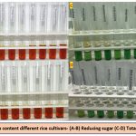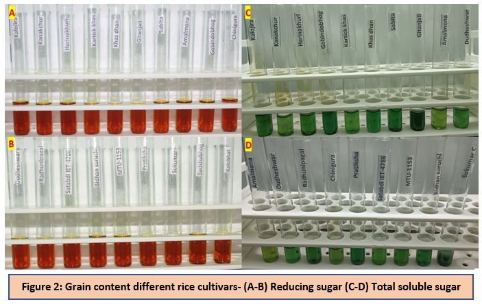 Figure 2: Grain content different rice cultivars- (A-B) Reducing sugar (C-D) Total soluble sugar |