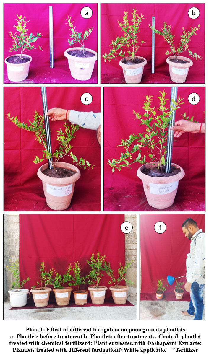 Plate 1: Effect of different fertigation on pomegranate plantlets. a: Plantlets before treatment b: Plantlets after treatmentc: Control- plantlet treated with chemical fertilizerd: Plantlet treated with Dashaparni Extracte: Plantlets treated with different fertigationf: While application of fertilizer |