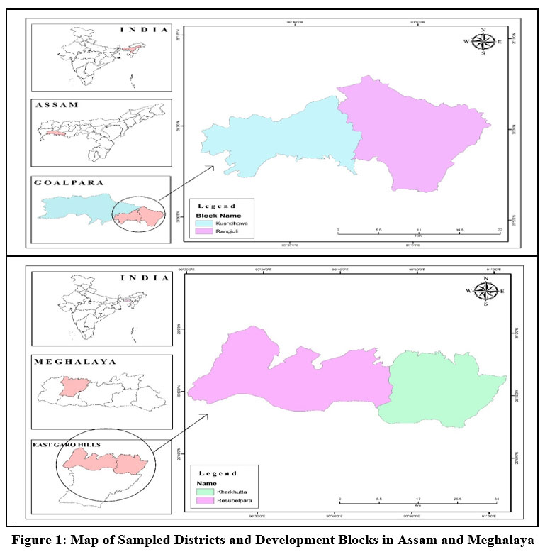Figure 1: Map of Sampled Districts and Development Blocks in Assam and Meghalaya |