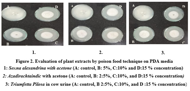 Figure 2: Evaluation of plant extracts by poison food technique on PDA media. |
