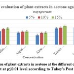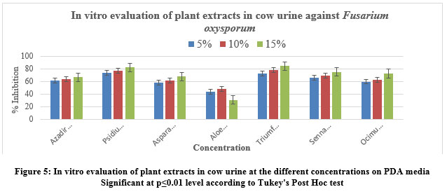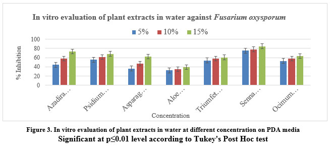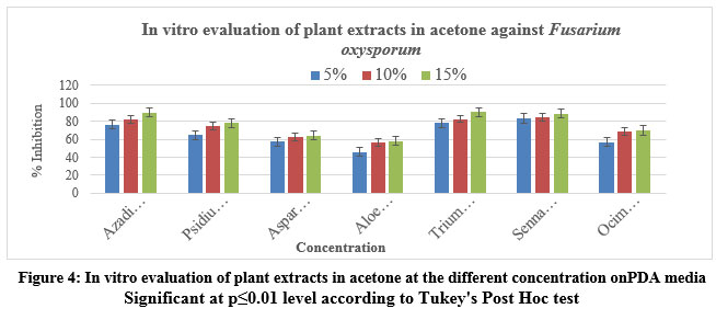 At a concentration of 5% in acetone, the most effective extract to inhibit mycelial growth was observed from Senna alexandrina (83.84%), followed by Triumfettapilosa (77.93%). Other tested extracts such as Azadirachtaindic, Psidium guajava, Asparagus racemosus and Ocimumtenuiflorum