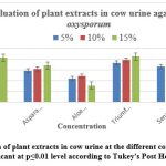 In plant extracts prepared from cow urine, Triumfettapilosa recorded the highest inhibition (84.33%) at a concentration of 15%, followed by Psidium guajava (82.0 %). At the same concentrations, extracts of Azadirachta indica, Asparagus racemosus, Senna alexandrina and Ocimumtenuiflorum showed potencies between 74.95 % and 67.77%. The least effective was Aloe barbadensis miller (30.48%).