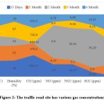 The concentrations of CO, NO, NO2, SO2, O3, and UV at the major traffic road and control sites respectively, are shown in Figs. 1 and 2. It is found that the air quality concentrations on the traffic road are higher than those at the control sites. There is a statistically significant difference between the means of the overall air quality index values (159.1˂269.2) at the control and traffic road sites.