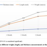 As shown in Figs. 3, 4, 5, and A to J, we observed that the growth terms (thickness, length, and weight) are lower in the crop growing near the road (Fig. B, D, F, H, J, and L) and higher in the control sites (Fig. A, C, E, G, I, and K) throughout the observation. As shown in figures K and L, the control did not show chlorosis and scarring on the leaves, while similar conditions were present on the traffic road sites. Showing a statistical difference in the mean values of the growth parameters (thickness: 8.4 ˃ 5.6, length: 23.4 ˃ 13.1, and weight: 7.16 ˃ 5.19) between the control and traffic road sites. The control and traffic road site data are statistically significant (P<0.05).