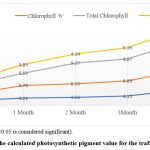 Show that, throughout the entire report, we demonstrated the difference between the crop growing alongside the traffic road and the control sites in terms of growth terms (thickness, length, and weight). It is established that the leaves on the traffic road had chlorosis, scars, and poor colour quality, but the control locations do not. Demonstrating that the growth terms values (thickness: 41.00 ˃ 35.66, length: 50.6 ˃ 42.02, and weight: 44.49 ˃ 36.01) between the control and traffic road sites differed statistically. The findings from the traffic road locations and the control sites are statistically significant P<0.05. Every aspect of the study showed that in comparison to the control and traffic road location concentration of air pollution gases is higher, and as a result, the flow of air quality is higher. We observed that there is a statistically significant difference in the levels of the photosynthetic pigments chlorophyll ‘a’, chlorophyll ‘b’, total chlorophyll, and carotenoid between the crop growing alongside the traffic road and the control sites (chlorophyll ‘a’ 5.84 ˃ 5.56, chlorophyll ‘b’ 5.90 ˃ 4.79, total chlorophyll 11.28 ˃ 9.93 and carotenoid 4.47 ˃ 3.14). Data from the traffic road sites and the control site are statistically significant P<0.05 2. Recently more attention has been focused on global environmental problems.19 Some researchers have examined the biochemical parameters of the leaf of Triticum aestivum L. crop collected from a polluted site. Throughout the entire growing season, the chlorophyll ‘a’ concentration of crop leaf samples taken from the polluted location is consistently lower than that of those taken from the control site.20