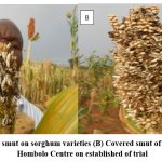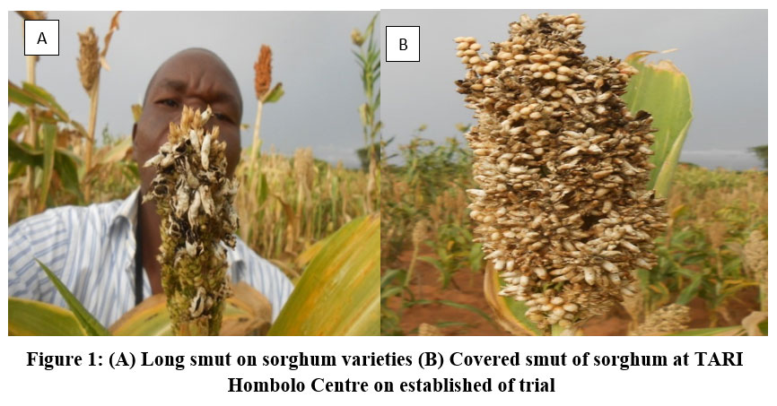 Figure 1: (A) Long smut on sorghum varieties (B) Covered smut of sorghum at TARI Hombolo Centre on established of trial |