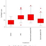 A significant variability in stem length among plants when treated with different treatments (F(3,116)= 21.247, p<0.001). Plants treated with encapsulated P. fluorescens 100% showed significantly (p<0.001) higher stem length compared to S. platensis 100% and significantly (p<0.001) lower stem length than control. NPK showed significantly (p<0.001) lower stem length than the control and higher (p<0.008) stem length than S. platensis 100%. Other treatments showed no significant variability in stem length.