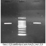 Figure 2: PCR amplification of genes from P6, Lane1- PCR product of Pyoluteorin (plt) Gene Lane 2- Marker: Lambda DNA/EcoR1 plus Hind III Double digest marker, Lane 3- PCR product of ACC Deaminase gene |
