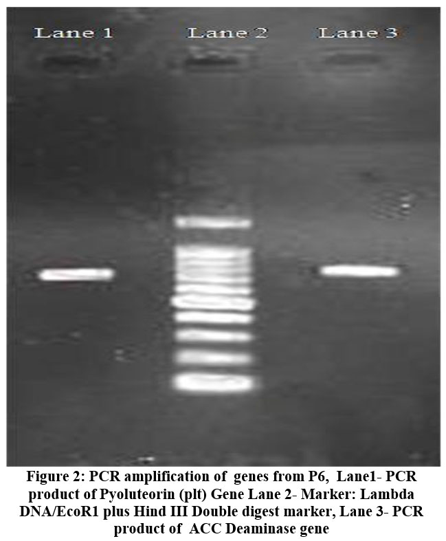 The presence of the Pyoluteorin (plt) Gene and ACC Deaminase Gene in the isolated P6 strain was identified by PCR. The agarose gel electrophoresis analysis of the PCR for the Pyoluteorin (plt) Gene revealed the formation of the expected 591 bp product. This was further confirmed by the DNA sequence analysis where the sequence of the isolated P6 showed 99.83% identity to the PLT gene of P. fluorescens strain. The agarose gel electrophoresis analysis of the PCR for the 1-aminocyclopropane-1-carboxylate deaminase gene revealed the formation of the expected 629 bp product. This was further confirmed by the DNA sequence analysis where the sequence of the isolated P6 showed 100% identity to the P. fluorescens gene for 1-aminocyclopropane-1-carboxylate deaminase.