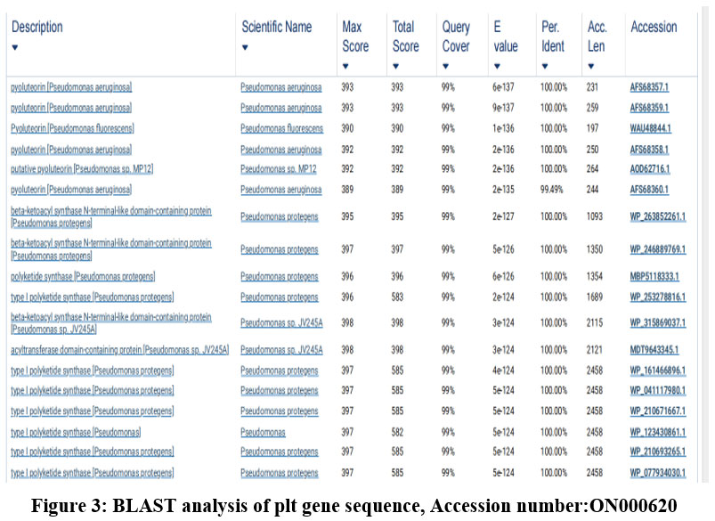 Figure 3: BLAST analysis of plt gene sequence, Accession number:ON000620 |