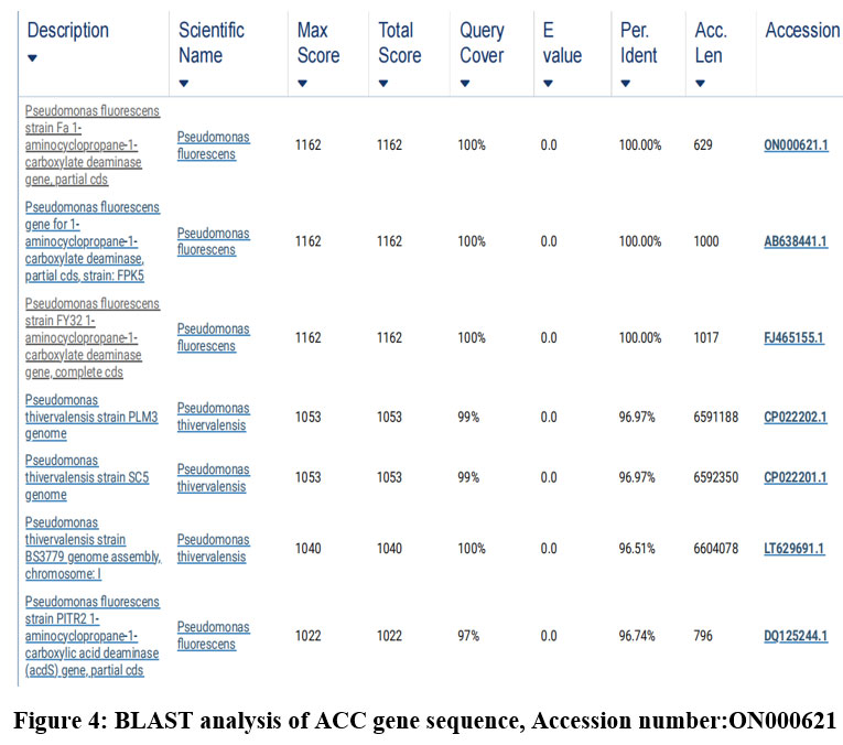 Figure 4: BLAST analysis of ACC gene sequence, Accession number:ON000621 |