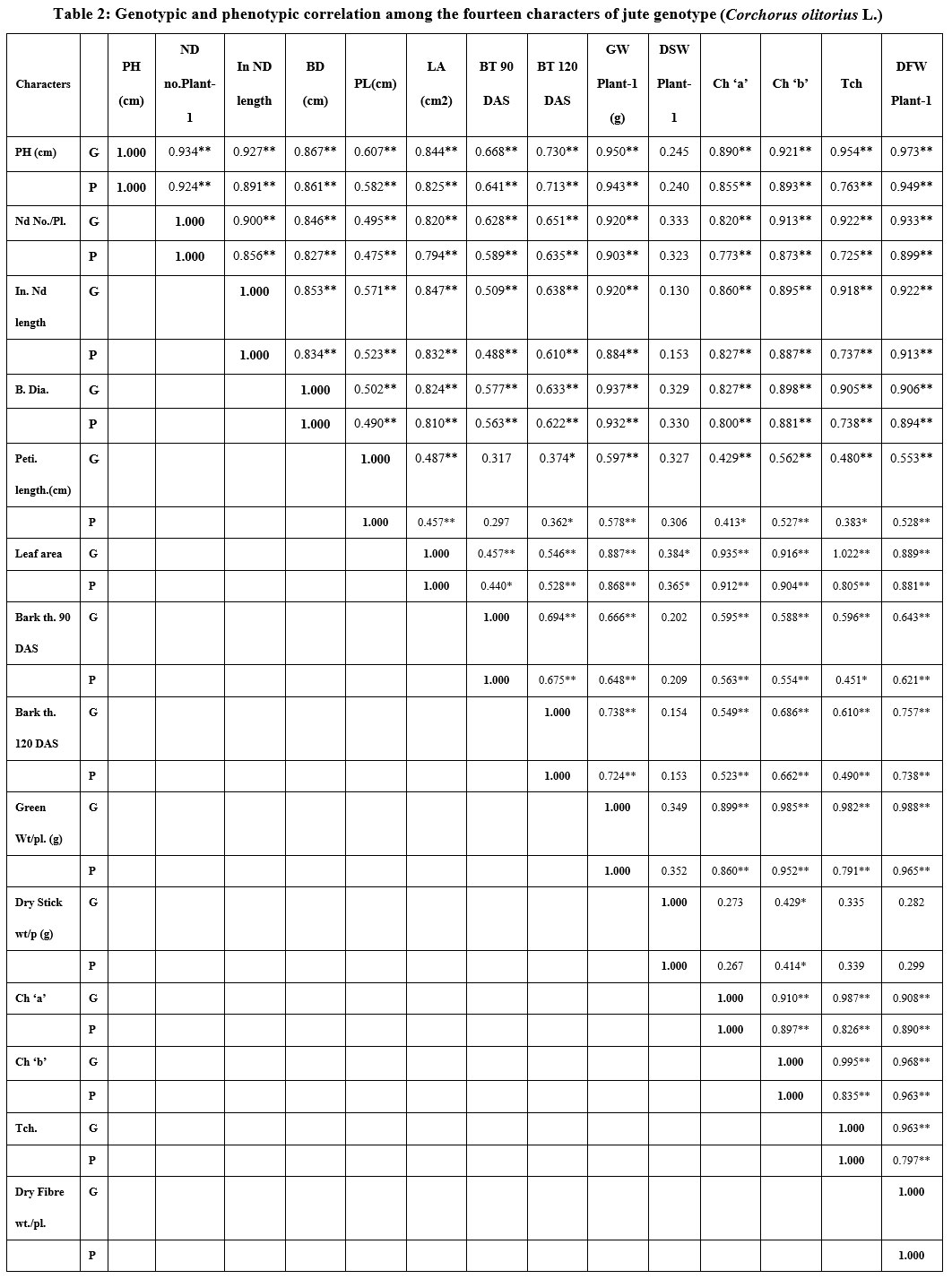Table 2: Genotypic and phenotypic correlation among the fourteen characters of jute genotype (Corchorus olitorius L.) |