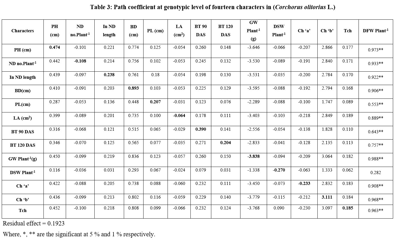 Table 3: Path coefficient at genotypic level of fourteen characters in (Corchorus olitorius L.). |