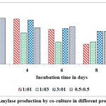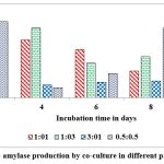 Co-cultured microorganisms have advantageous over the individual cultures as the synergistic action of metabolic way of organisms which naturally upgrade the production of commercial enzymes. In nature organisms are not survived as pure cultures and also microbes belong to identical genus encompass the better compatibility with each other, hence, widely used to produce different metabolites. This can be concluded from reports on pair of microbes such as Bacillus cereus and B. thuringiensis, Aspergillus niger MS23, and A. terreus MS105, Clostridium thermocellum ATCC 27405 and C.beijerinckii ATCC 51743, Aspergillus flavus and A. penicillioides.40, 41, 42, 43 Maximum levels of α-amylase ( 12 u/g of substrate) was record on 2nd day of fermentation when inoculated both cultures at 1:1 ratio and the enzyme secretions are gradually decrease when the incubation period is increasing from 2nd day to 10th day (Fig. 9). Dreaded amount of α-amylase was observed when inoculated these cultures at 1:3 ratio on 10th day of incubation. Maximum levels of gluco-amylase (3 u/g of substrate) was observed on 2nd day of fermentation when inoculated both cultures at 0.5: 0.5 and the enzyme secretions are gradually decrease when the incubation period is increasing from 2nd day to 10th day (Fig. 10). Dreaded amount of gluco-amylase was observed when we inoculated these cultures at 0.5:0.5 ratio at 10th day of incubation.