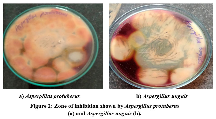 Figure 2: Zone of inhibition shown by Aspergillus protuberus (a) and Aspergillus unguis (b). |