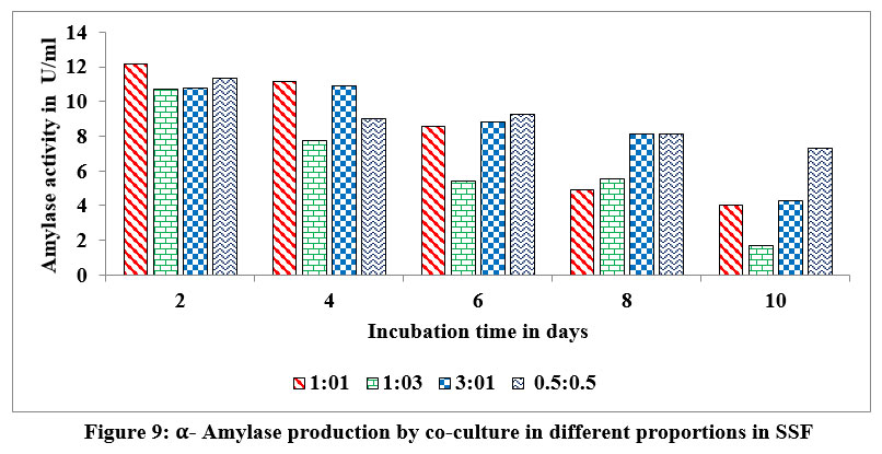 Figure 9: α-Amylase production by co-culture in different proportions in SSF |