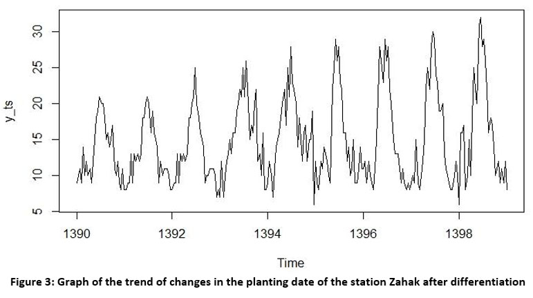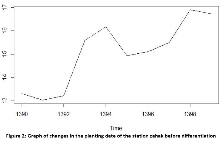 In this study, a graph related to self-correlated data for planting date was drawn to determine the trend of changes, to determine the seasonality and identification of outflow data, and then using information related to the past years of planting date in the station of Zahak, In regions where meteorological data has a sufficient statistical duration, serial-time models are applied. Numerous time series models help analyze changes and simulate outcomes. We can precisely highlight the seasonal model of Sarima and the typical model of Sarima among these. The first stage should involve looking at the average stability and static data. It shrinks in on itself. Data were static by differentiation in the current investigation (Figures 2 and 3). station flow correlation diagrams and partial self-correlation diagrams. Figures 4 to 6 show the before and after of differentiation so that the proper coefficients for Extracted p, q can be applied.
