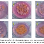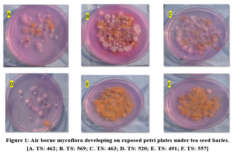 Figure 1: Air borne mycoflora developing on exposed petri plates under tea seed baries. [A. TS: 462; B. TS: 569; C. TS: 463; D. TS: 520; E. TS: 491; F. TS: 557].