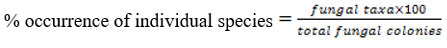Quantitative compositions of mycoflora were determined by counting the number of total colonies and percent occurrence of individual taxa was obtained as per following formula given by,23 with slight modification.