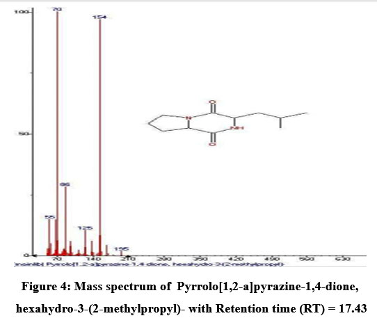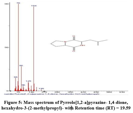 The actinomycetes crude extract from a novel strain of Streptomyces sp. strain MUSC 149T displayed remarkable antioxidant activity. Furthermore, chemical analysis confirmed the existence of a volatile metabolite Pyrrolo[1,2-a]pyrazine-1,4-dione, hexahydro- by GCMS with antioxidant properties.45 Similarly, Bacillus tequilensis MSI45 a sponge associated bacterial strain whose crude extract showed the occurrence of pyrrolo[1,2-a]pyrazine-1,4-dione,hexahydro- a bioactive antimicrobial secondary metabolite.46