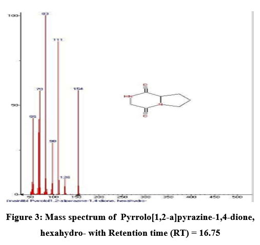 Figure 3: Mass spectrum of  Pyrrolo[1,2-a]pyrazine-1,4-dione, hexahydro- with Retention time (RT) = 16.75