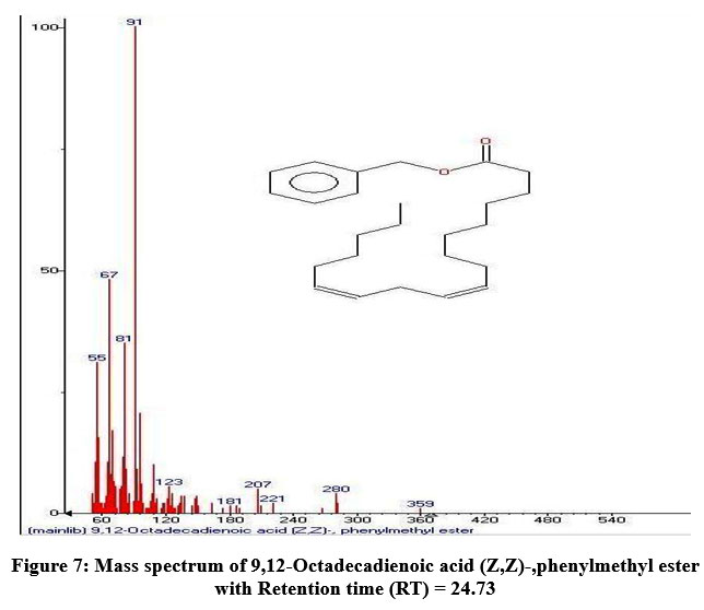 24.73 9,12-Octadecadienoic acid (Z,Z)-,phenylmethyl ester C25H38O2 370 10.7 Anti-microbial Anticancer 69