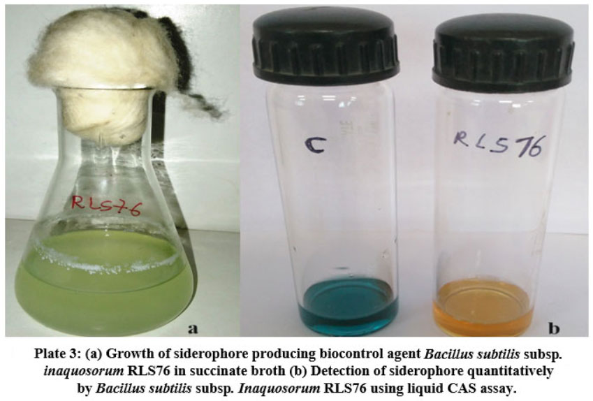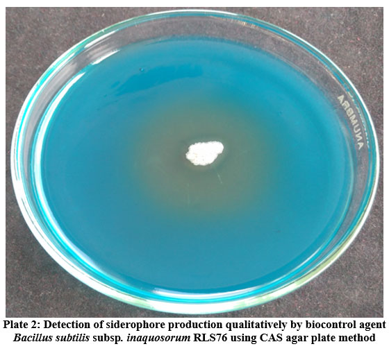 The qualitative and quantitative method was employed to conduct an analysis of siderophore production of biocontrol agent Bacillus subtilis subsp. inaquosorum RLS76.
