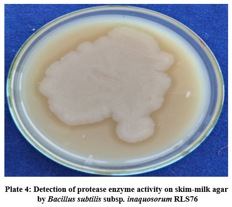 Plate 4: Detection of protease enzyme activity on skim-milk agar by Bacillus subtilis subsp. inaquosorum RLS76
