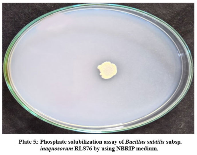 The Bacillus subtilis subsp. inaquosorum RLS76 exhibited phosphate solubilization activity with the clear halo around the colonies (Photo Plate 5). The diameter of a clear halo surrounding the inoculated colony was measured in mm and found to be 5 mm (Table 6).